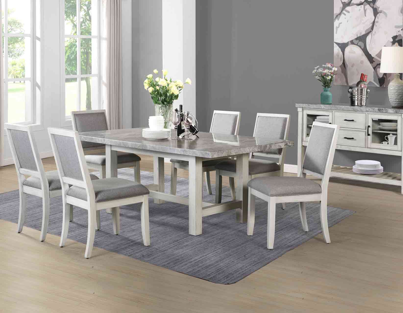 Clean lines and simple sophistication are the hallmarks of the Canova gray marble dining set. A Cathedral White wood finish pairs with gray marble tops to create a rustic yet elegant design that is beautiful in classic, contemporary or farmhouse setting. Gray velvet chairs are easy-to-clean and add comfort to the dining collection.