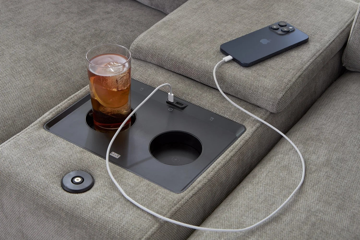 Create your ideal living space with our fully modular Cardiff sectional, designed to adapt to any configuration your heart desires. Includes a variety of pieces such as a left arm chair, right arm chair, armless chair, corner chair, and a FREE innovative entertainment console. The entertainment console is a true game-changer, featuring motorized cup holders that double as a wireless charging station. Comfort is paramount with reversible seat cushions made from CertiPUR-US certified foam, and self-colored pillows that seamlessly match the luxurious velvety sheen of the body fabric. Experience unparalleled flexibility, comfort, and style with our modular sectional, perfect for any home.