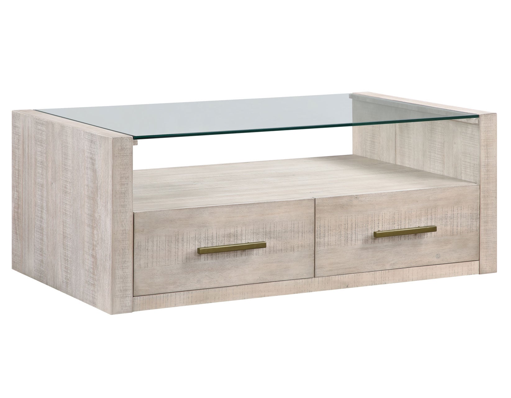 Bring casual elegance to your living room with the Garland Castered Coffee Table, a stylish blend of modern design and rustic charm. Its clean lines and saw rasp distressing in a cool washed parchment finish create a contemporary focal point for the living room. The clear glass top offers a lovely display area, while two drawers provide convenient storage for essentials. With hidden casters, it’s easy to move the table for cleaning or when you need extra space to relax. This coffee table is both functional and chic, perfect for any home.